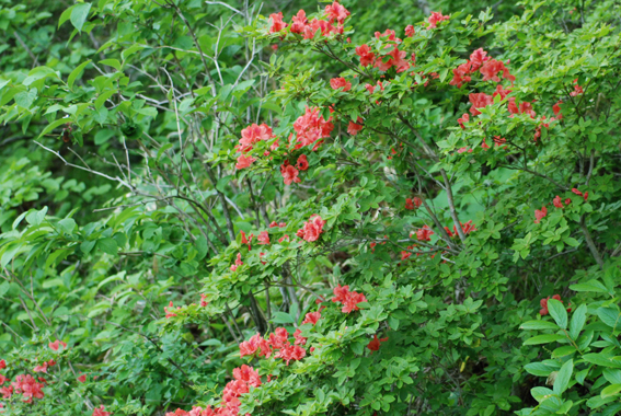 亀田川上流域調査の一週間あまり後,二回目の函館山調査に出かけました。ルートは前回の逆とし,まずは,ツツジ山駐車場から旧登山道を途中まで降りながらの植物観察です。入り口では,オオバナノミミナグサ(ナデシコ科)が出迎えてくれました。この植物は,海岸近くに生育する代表的な植物であり,函館山の麓から山頂まで随所に見られました。そして,ヤマツツジ(ツツジ科)と咲き始めたタニウツギ(スイカズラ科)が彩りを添えますが,この二つは亀田山地側にも沢山あります。次いで木の花の白い蕾が随分目立ちましたが,14日に確認したところワタゲカマツカ(バラ科)でした。これも,初夏の函館山を代表する植物でしょう。更に木本では,キンギンボク(スイカズラ科)とミズキ(ミズキ科)が開花期であり,海岸らしくカシワ(ブナ科)も花を付けていました。