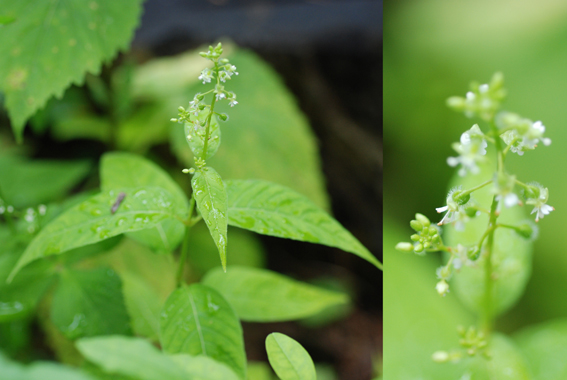 8月1日は,水曜日なのに月曜授業という変則的曜日でしたので,午後から学生を連れて亀田川上流域に植物観察に行きました。好天に恵まれましたが,7月下旬の大雨の影響が強く,川も多少濁り,中野ダム湖も褐色を帯びていました。しかし,山中はまさに夏です。うっそうとした深緑の中は,初夏とは違った雰囲気が満ちあふれていました。開花植物相も大きく変わっています。ヤマブキショウマ(バラ科)が終わりつつある中,トリアシショウマ(ユキノシタ科)が目立ち始めていますが,写真では厳密には区別をつけづらいので,ここでは紹介は控えましょう。岩場を中心に多く生育していたのは,イワアカバナ(アカバナ科)とオシマオトギリ(オトギリソウ科)でした。両者ともそれぞれごく近縁のアカバナおよびオトギリソウと区別が難しい植物ですが,それらしい写真を撮りましたので,敢えて紹介します。他には,アマチャヅル(ウリ科)が比較的目立ち,花も咲かせていました。また,もう実の状態ですが,ミヤマキヌタソウ(アカバナ科)が道端で小群落を作っていました。来年は開花期の写真を撮りたいものです。