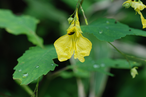 一方,林床を抜けるやや湿った登山道沿いには,やはり亀田山地側と共通の植物が沢山生育しています。ここではその中から,今回初登場のミツモトソウ(バラ科),ナンテンハギ(フタバハギ,マメ科),ミミコウモリ(キク科)と,咲き始めましたお馴染みのキツリフネ(ツリフネソウ科)を紹介しましょう。キツリフネは,これから秋に向かって全山を彩るでしょう。
